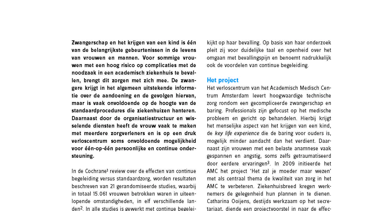 In november 2015 is er een mooi artikel gepubliceerd in het NTOG door en over doula Catharina Ooijens en haar werk in het AMC. mede auteurs zijn: dr. J.J.H. Bakker (klinisch verloskundige) en dr. I.M. de Graaf (gynaecoloog) allen werkzaam in het AMC in 2015.